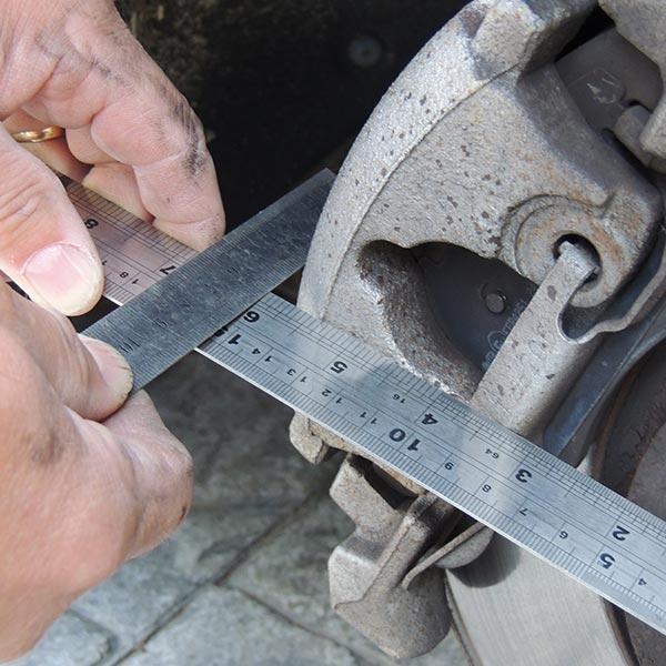 Commencez par mesurer la hauteur de votre étrier. Puis, à l’aide d’une seconde règle placée à horizontale contre le moyeu, son élévation par rapport à ce dernier. Enfin, mesurez la dernière côte: la distance entre le moyeu et l’étrier.