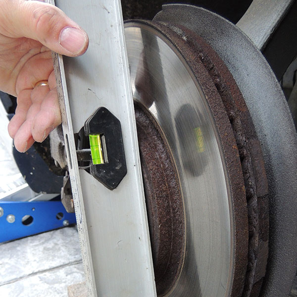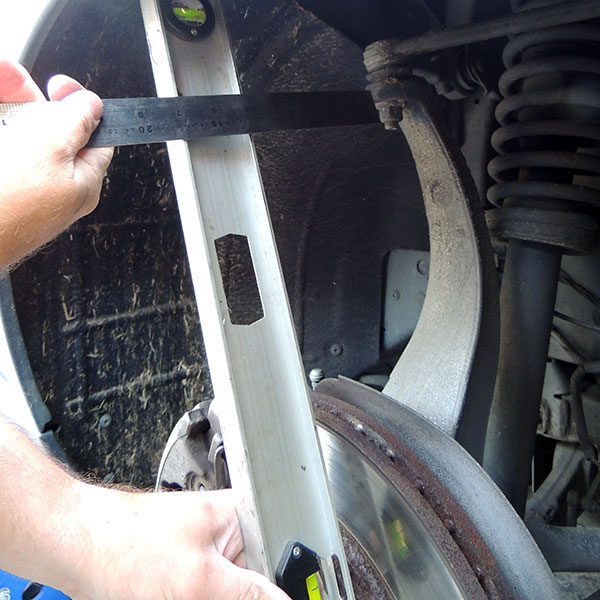 Appuyez le niveau sur le moyeu, à la verticale. Mesurez ensuite la distance entre la face intérieure du niveau et le premier élément que la roue viendra rencontrer: ressort, coupelle d’amortisseur, rotule…