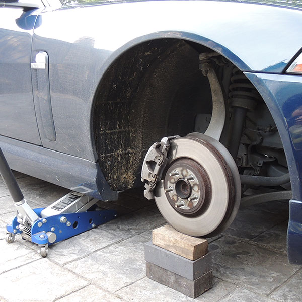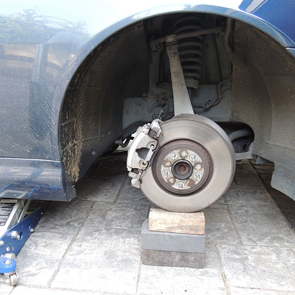 Une prise de mesures optimale requiert un correct positionnement de l’auto. Commencez par mesurer la garde au sol du moyeu, ou toute autre élément situé près de la roue. Calez la voiture à l’aide d’une vitesse, d’un frein à main et si possible d’une cale. Desserrez la roue, montez l’auto à l’aide d’un cric, puis démontez la roue. A l’aide des cales, créez un support sur lequel le moyeu va venir se poser en rabaissant la voiture. L’objectif étant qu’il soit à la même hauteur qu’avec une roue. Rabaissez l’auto jusqu’à retrouver sa hauteur de caisse normale.