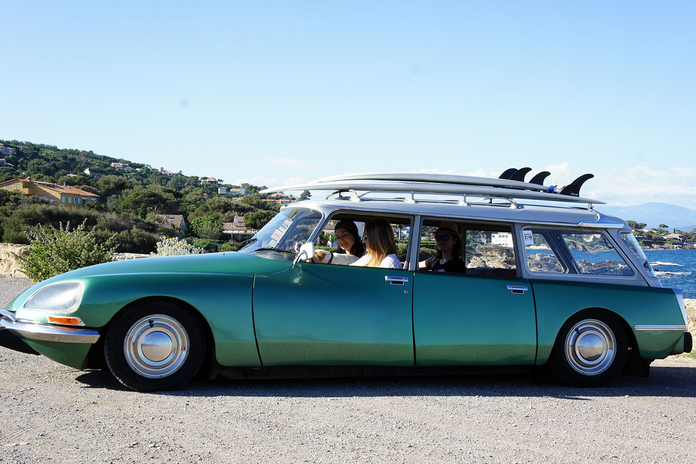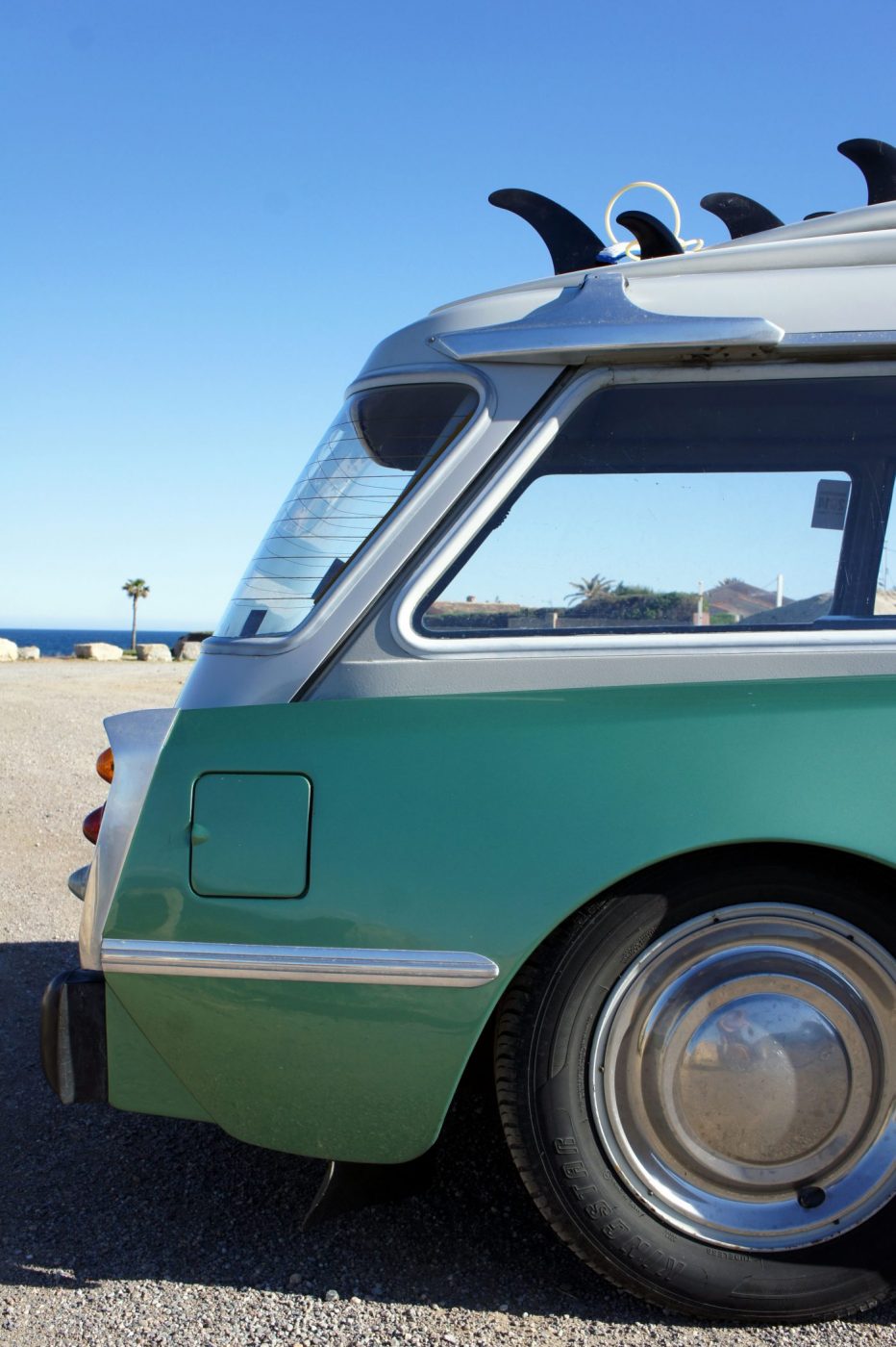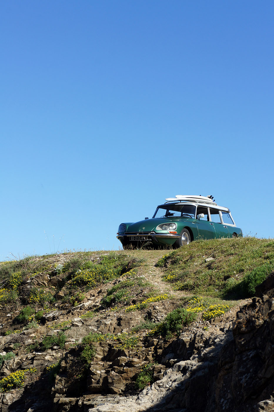 Quel heureux homme que l’auteur dont le quotidien consiste à partir à l’océan accompagné de belles surfeuses sous un ciel bleu intense, juste pour écrire un article sur une vieille DS verte.