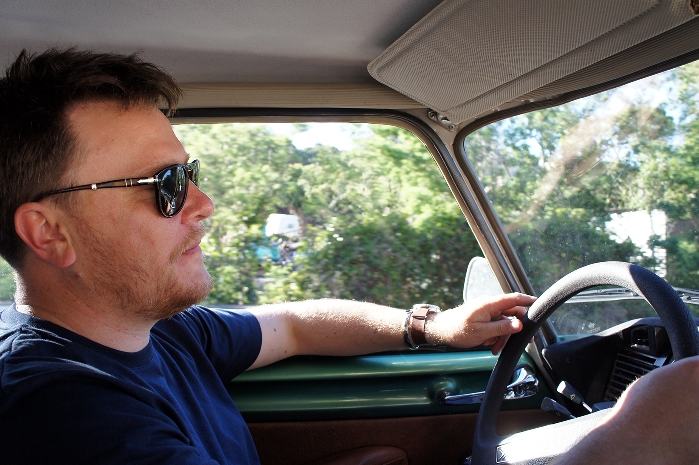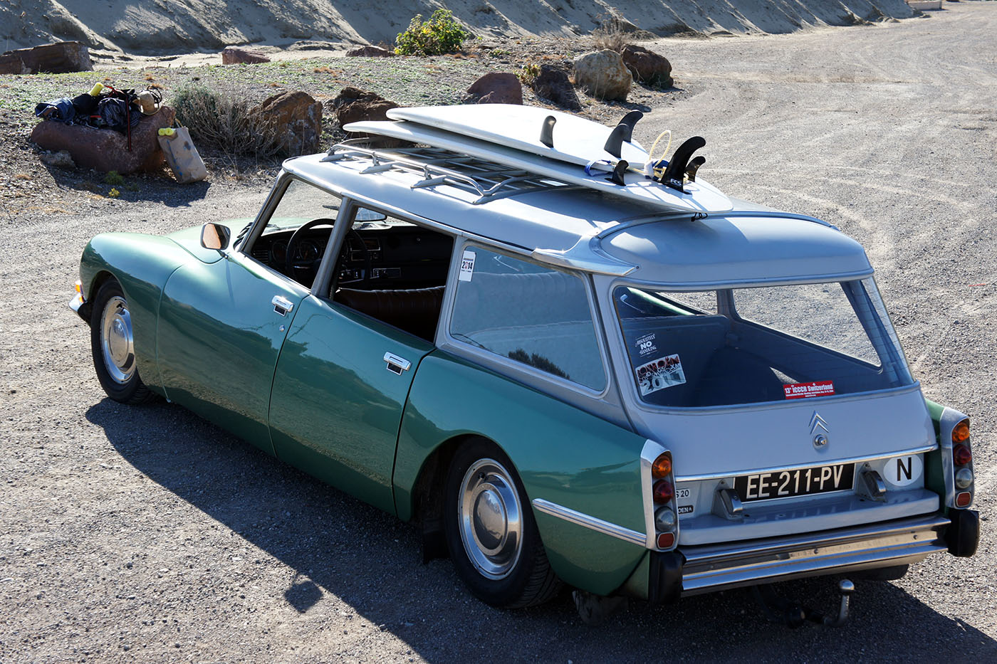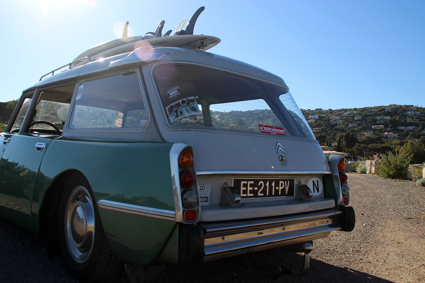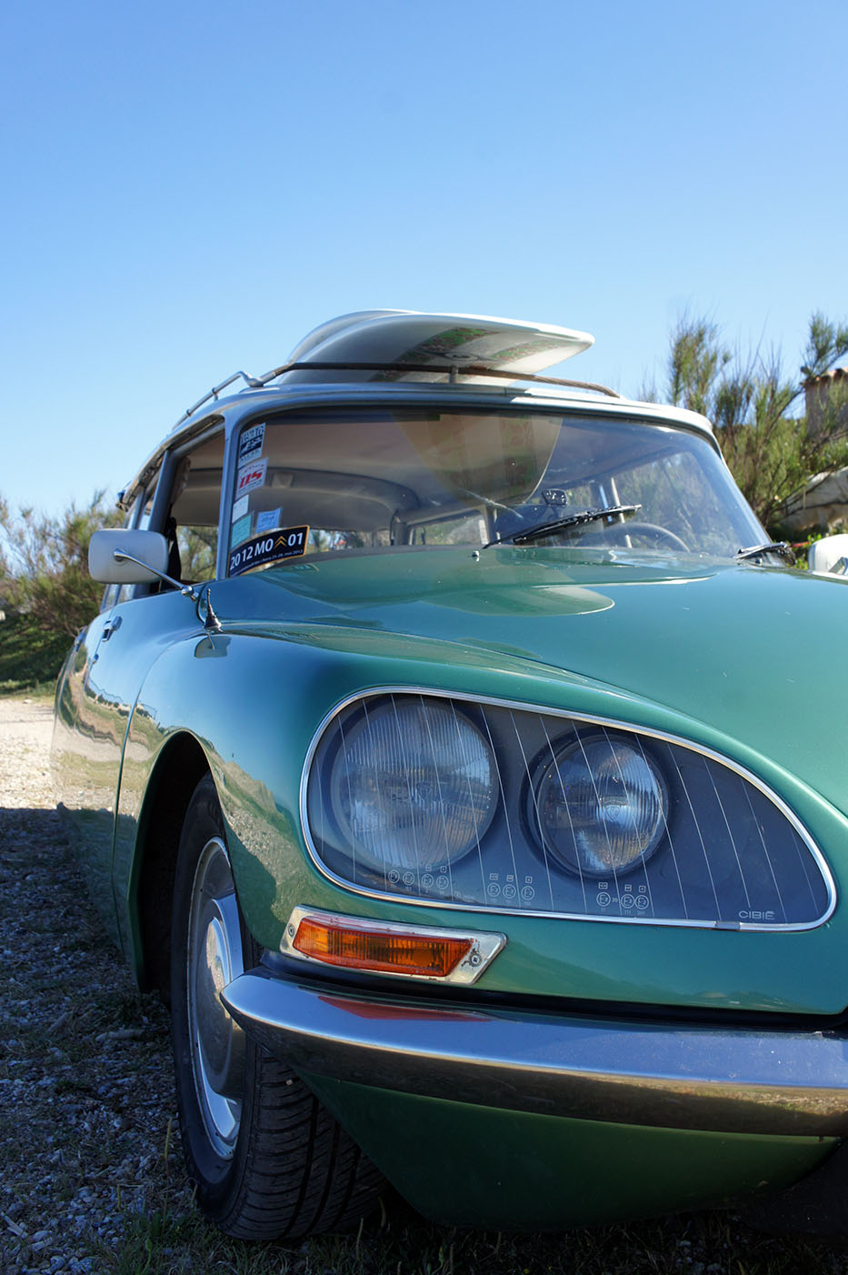 Quel heureux homme que l’auteur dont le quotidien consiste à partir à l’océan accompagné de belles surfeuses sous un ciel bleu intense, juste pour écrire un article sur une vieille DS verte.
