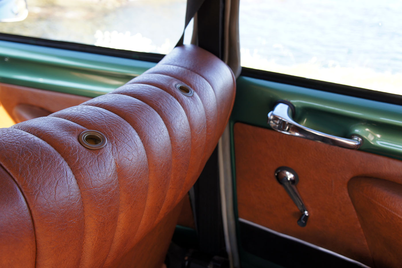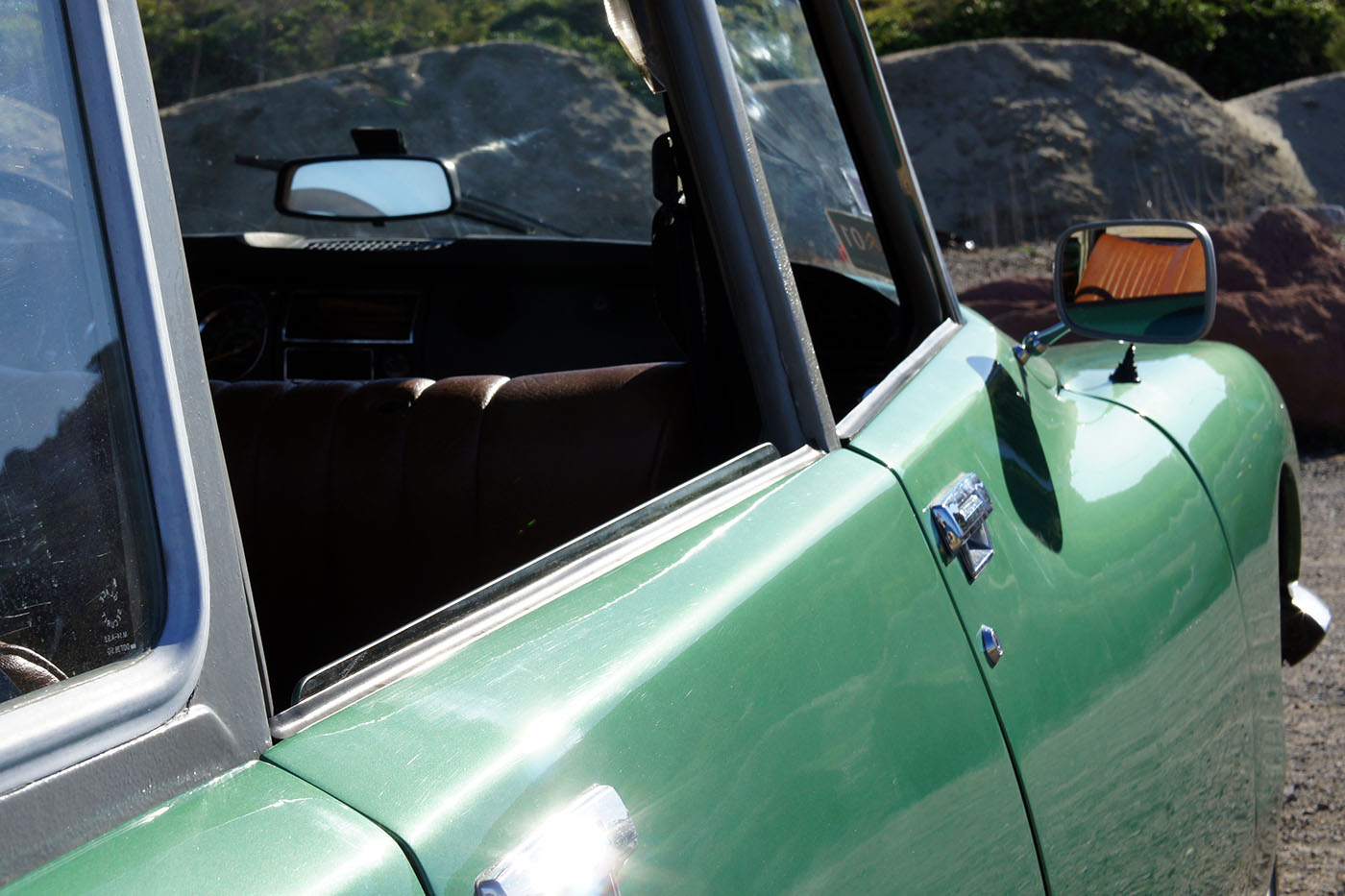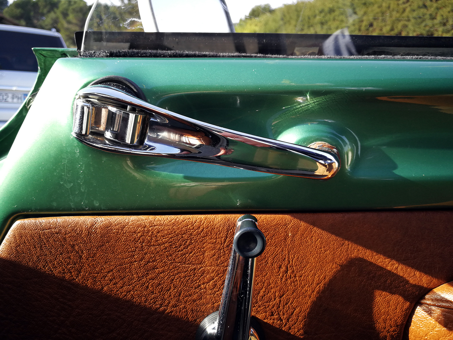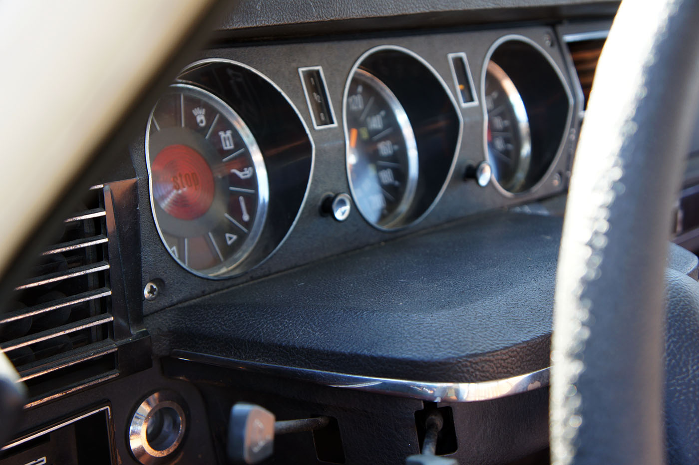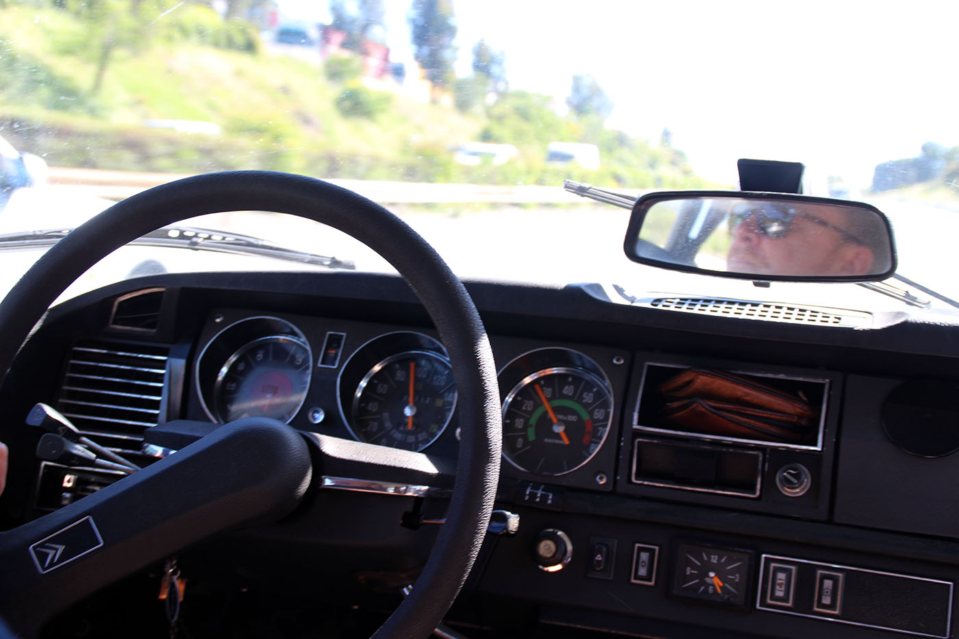 Quelques détails datent toutefois l’auto: nous sommes en 1974 et Citroën continue de poser le rétroviseur central sur le tableau de bord. Puis… Diable. Les poignées de porte sont encore là. Magnifiques, vous-vous apercevez rapidement qu’elles ont été conçues par un pur maniaque. Un de ces types qui ont inventé la soit-disant ouverture facile ou le capteur tactile au dos des téléphones. Une petite gâchette permet d’ouvrir la porte. En poussant cette même gâchette, la porte se verrouille. C’est alors qu’un cylindre chromé pivote sur lui-même pour maintenir cette position verrouillée. Jusqu’ici tout va bien. MAIS IL FAUT DEUX MAINS POUR DÉVERROUILLER CE TRUC: une qui pousse la gâchette qui empêche le cylindre de reprendre sa position originelle, une qui fait pivoter le cylindre glissant. Quelqu’un chez Citroën as-t-il essayé ce truc avant de le valider?
