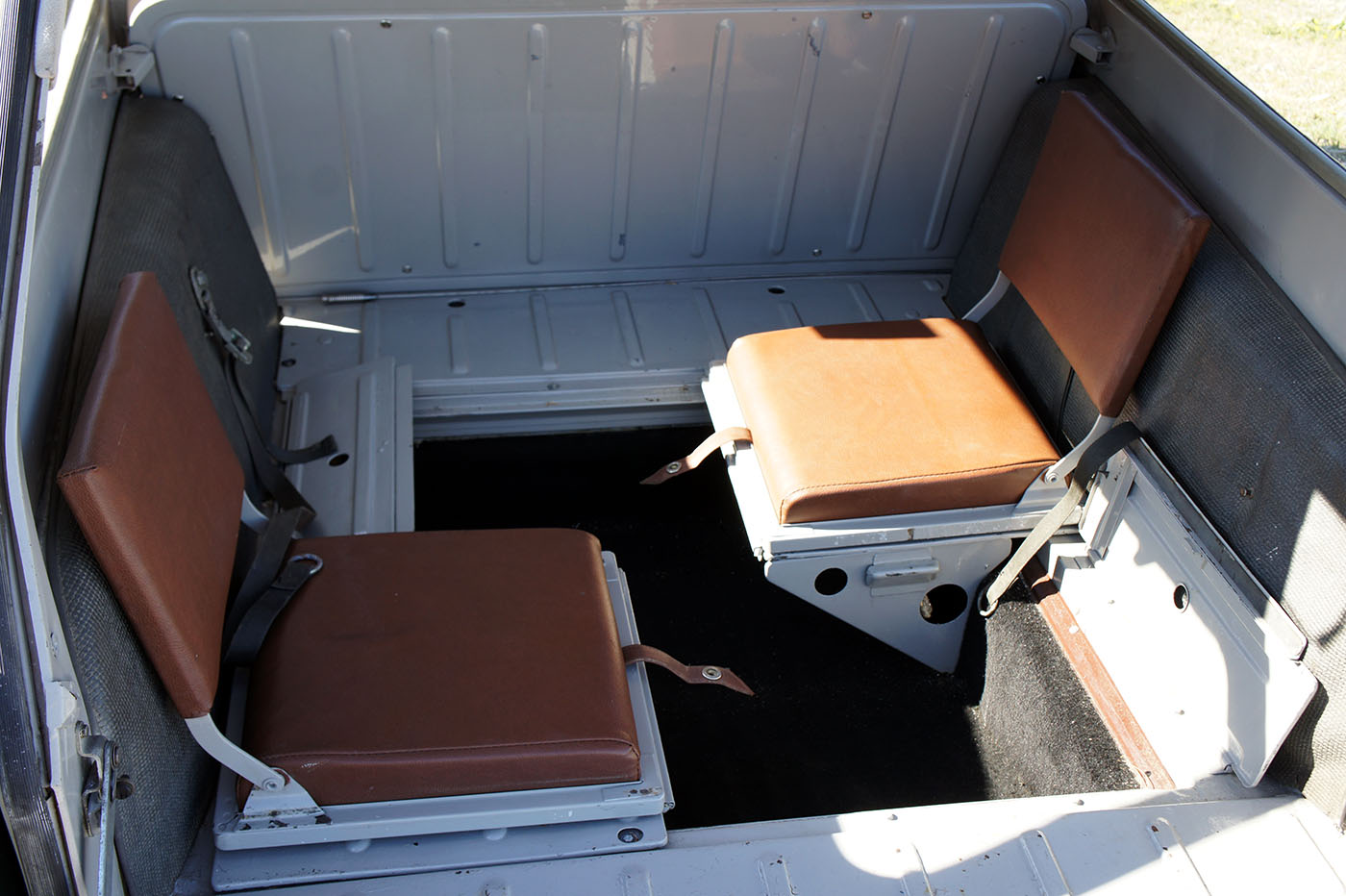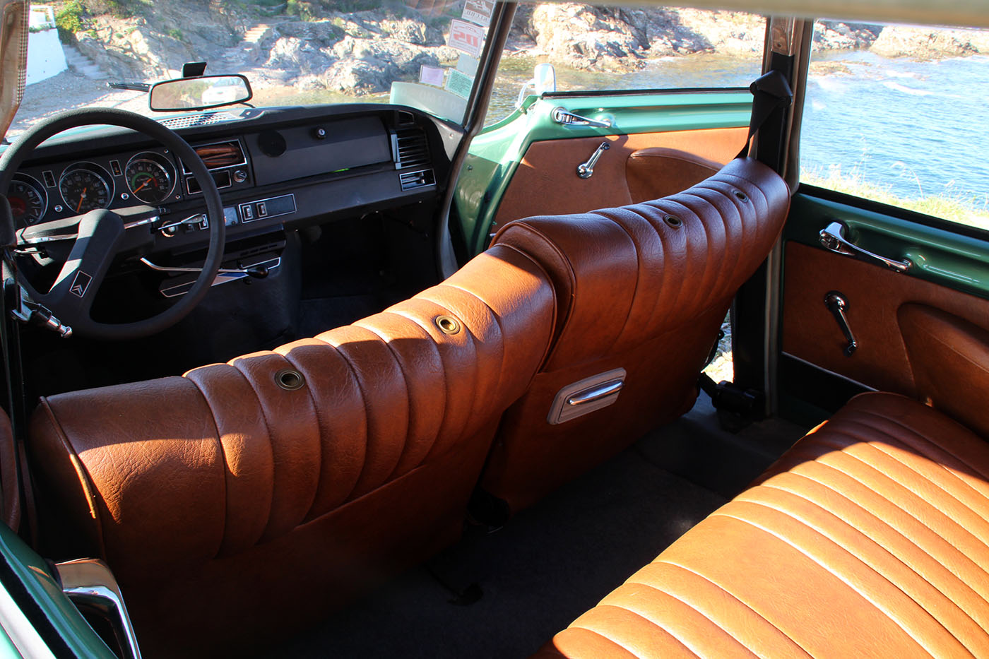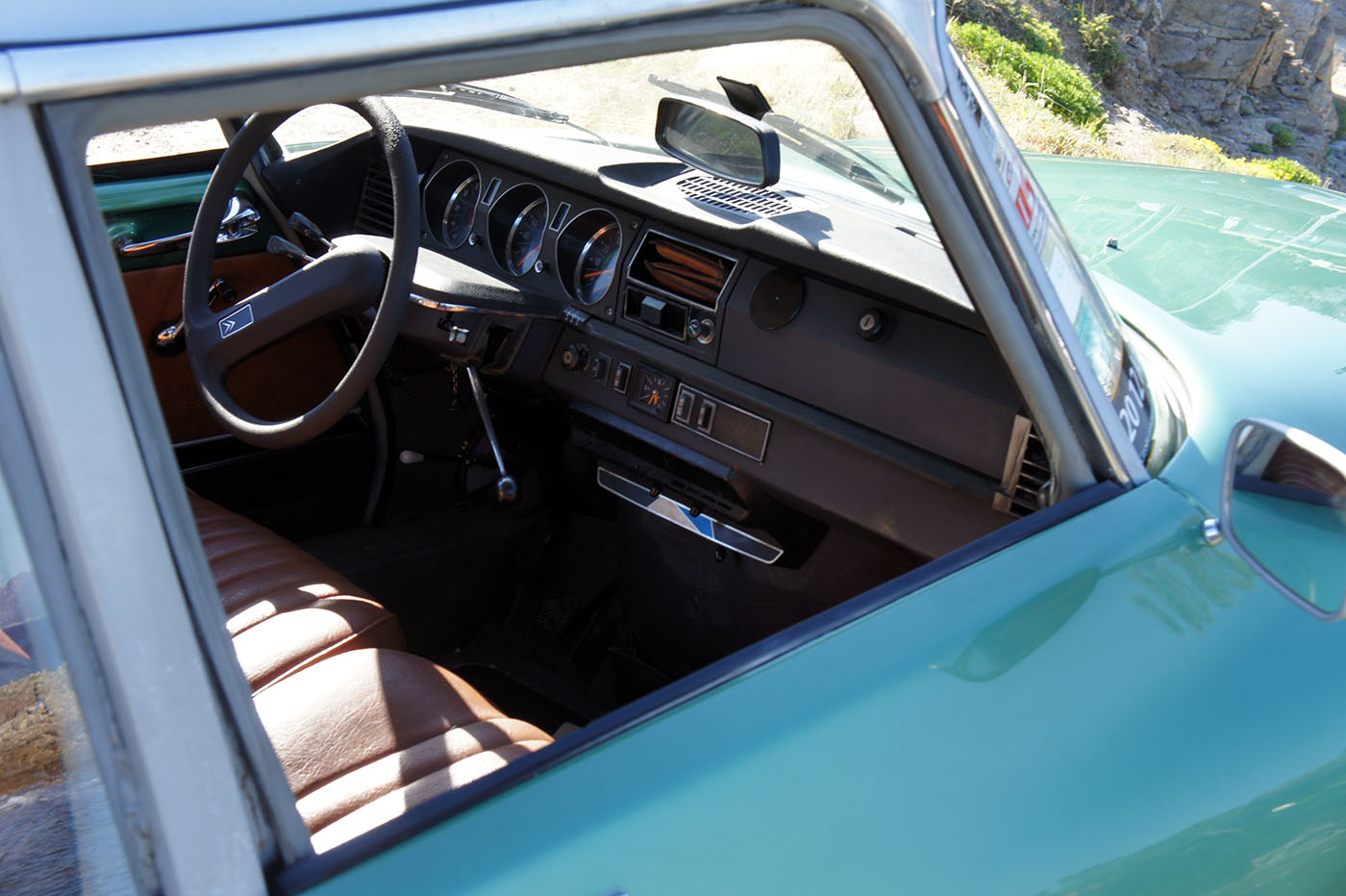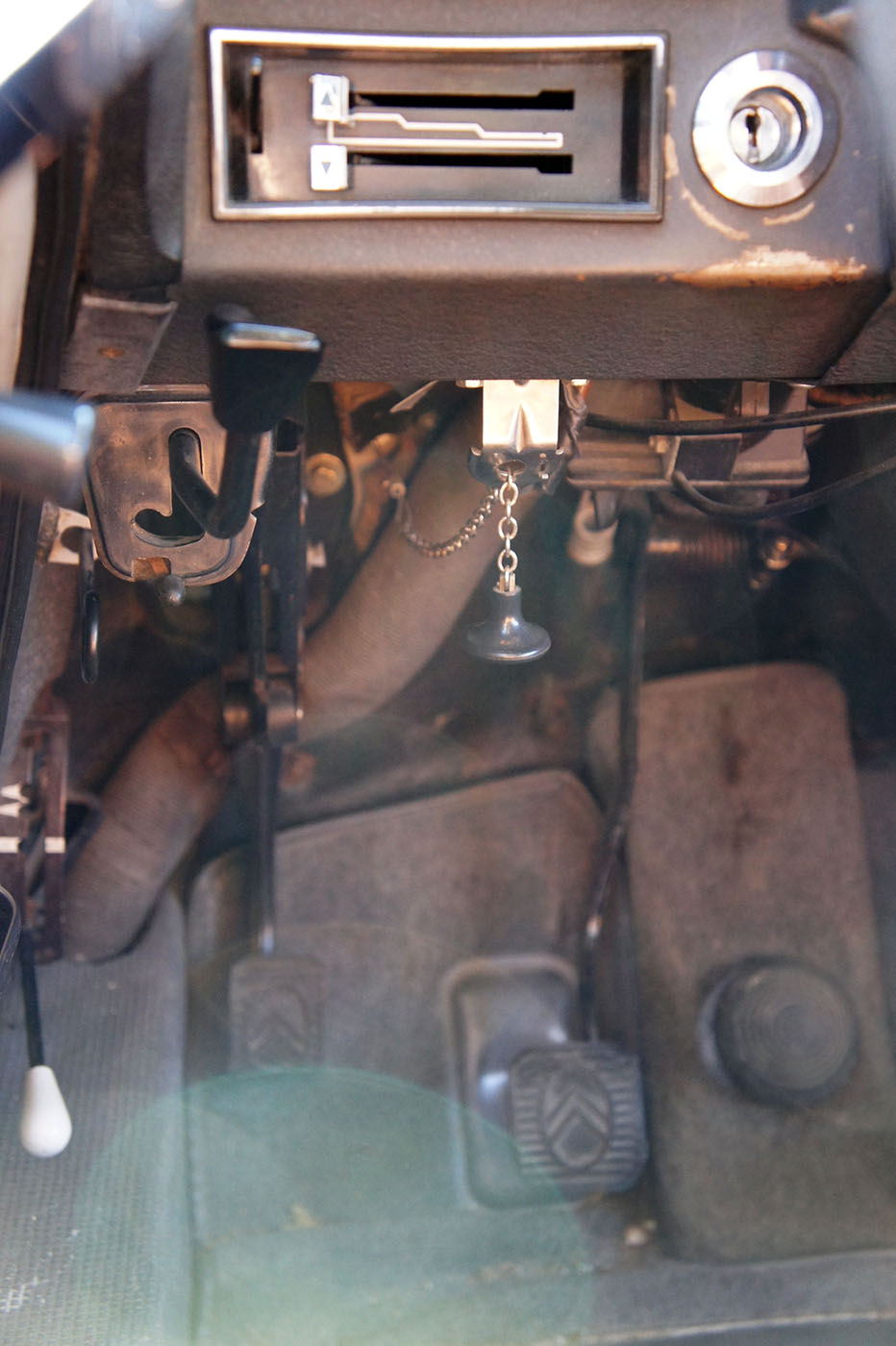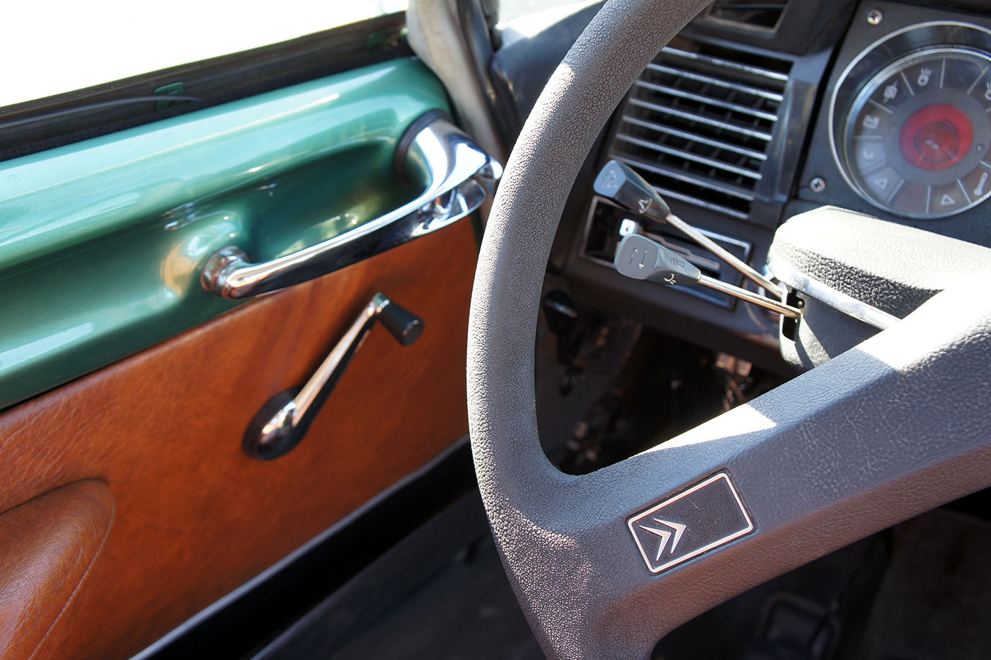 C’est la seule auto au monde ou l’on descend à la fois pour s’installer à bord et pour en sortir. Même sur les modèles produits après 1967, équipés d’une planche de bord en tôle vermiculée, l’atmosphère intérieure reste plaisante. On retrouve l’odeur typiquement Citroën, le grand volant à simple branche, de travers, qui donne une vision parfaite sur l’instrumentation et les trois commodos de commande. Ce bon vieux volant en caoutchouc roussi par le soleil, qui a gonflé et n’est plus collé à la jante… Le merveilles des matériaux synthétiques qui prennent de l’âge…