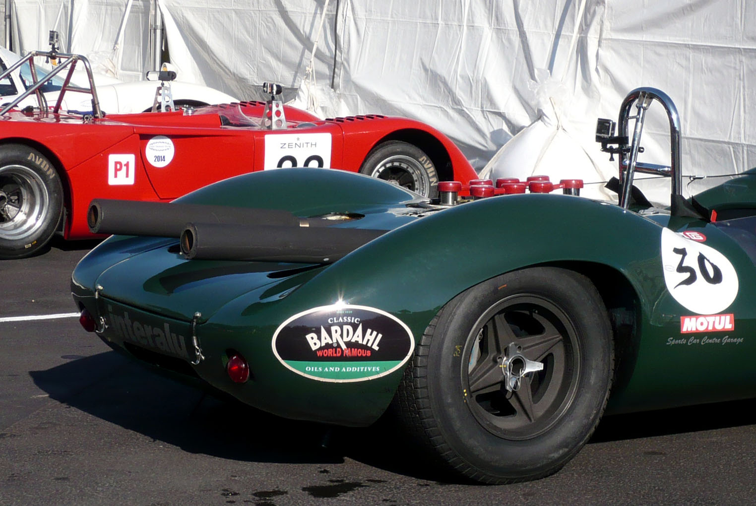 Plus loin dans les stands se trouve le plateau totalement hétéroclite des 60’s endurance: le 4 cylindres 2,7L de 102 shetlands d’une Healey 100 côtoie les 170 d’une Aston Martin DB 2/4, elle même toisée par une Shelby Ac Cobra et ses 417 chevaux. Entre elles, une auto dont la silhouette hésite entre une Corvette Sting Ray et une sorte de Ginetta: c’est une rare Morgan +4 SLR. Son incroyable dessin taillé dans cette coque tout en aluminium date de 1962. Dessinée par Morgan, assemblée par Morgan sur un châssis de +4, elle a remporté une victoire de classe au Mans en 1962. Seulement 3 exemplaires seront produits.