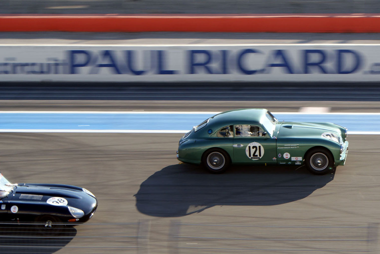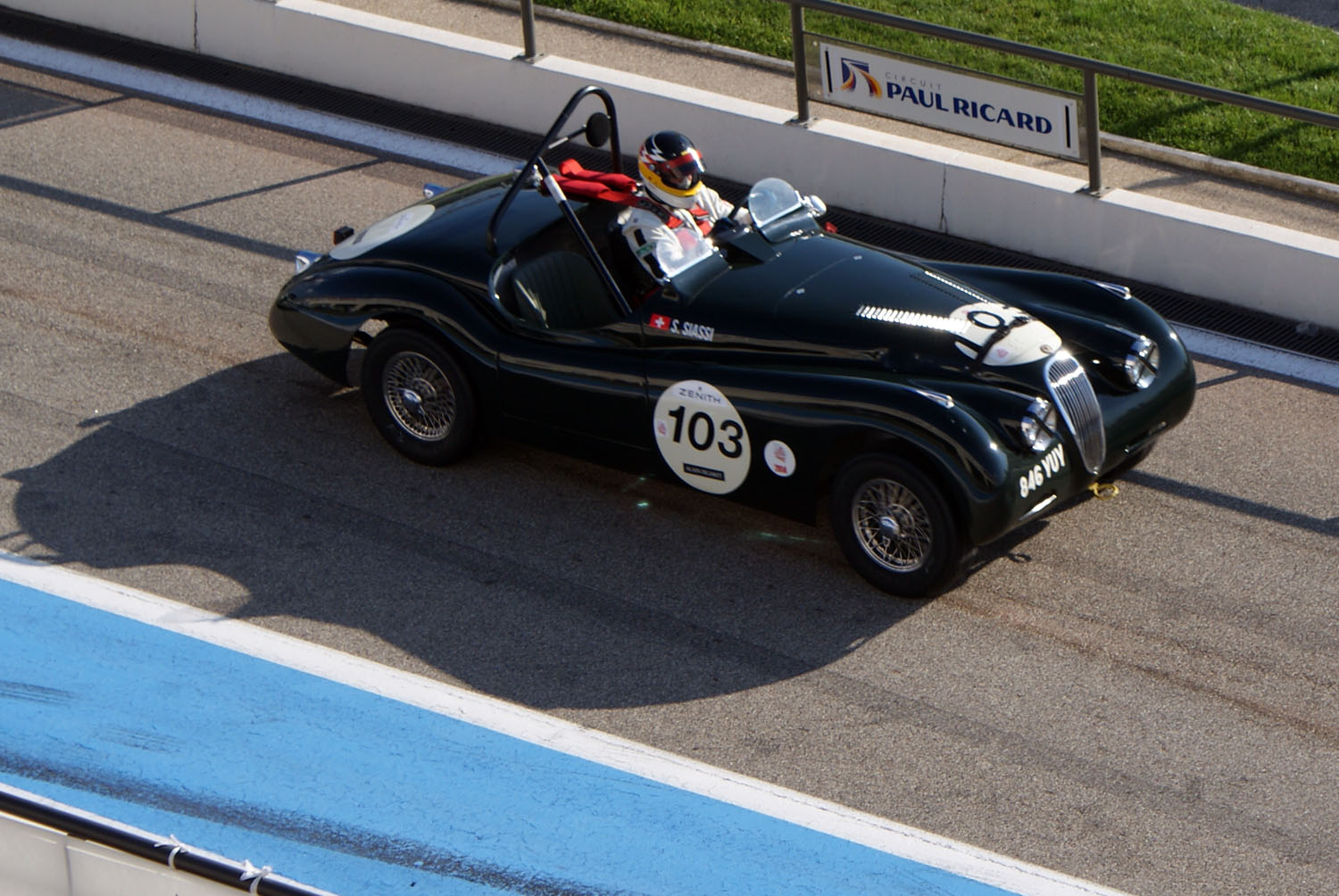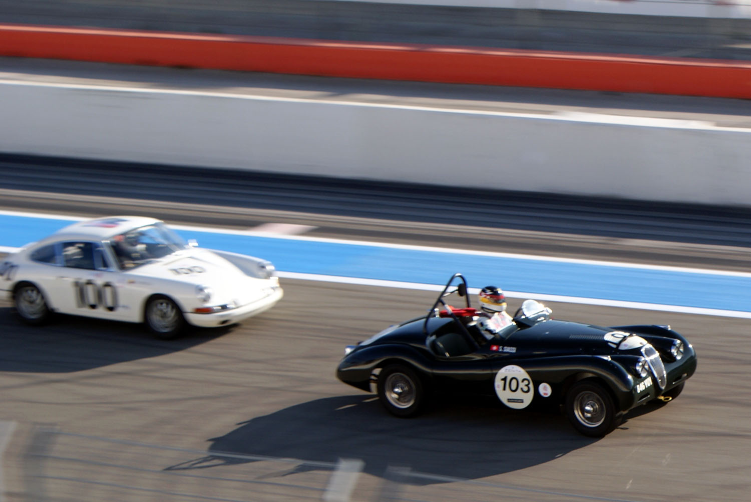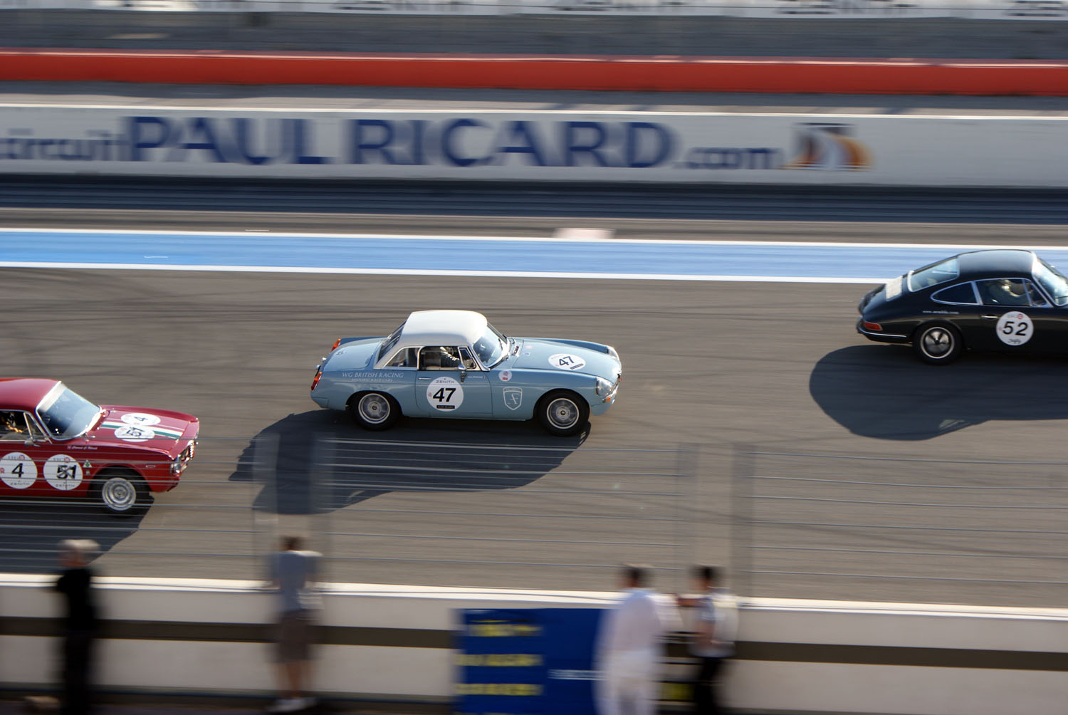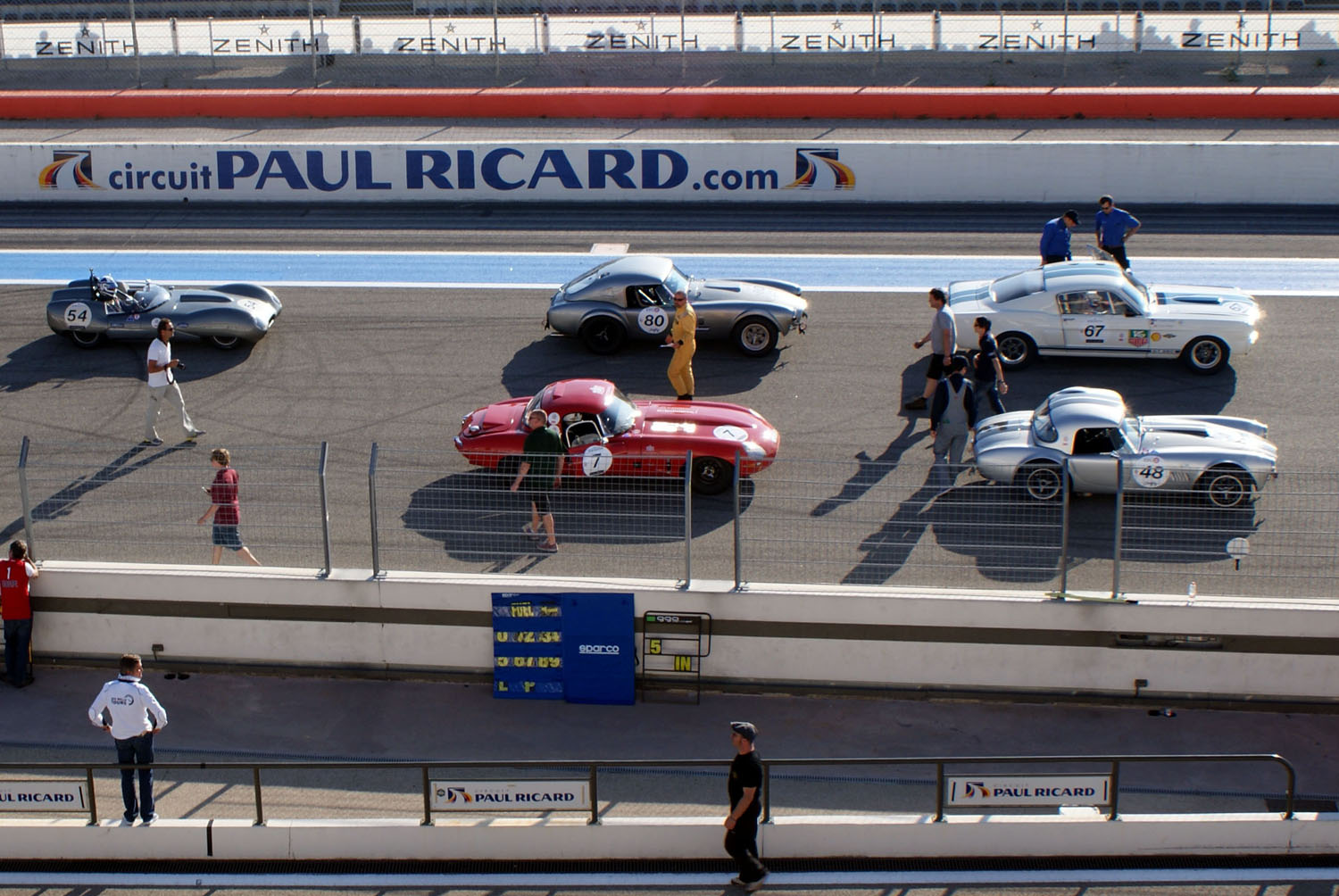 Malgré les divers passages de sécurité, la prestance de votre équipage mobile a réussi à s’infiltrer sur la piste du Castellet. Vous voici désormais arrêtés, derrière les deux Healeys 100 qui ferment le peloton. 2 minutes avant le tour de chauffe tous les pilotes démarrent leurs engins. Entre les borborygmes rauques de cobras, les hurlements métalliques des Porsche, le son lourd et rond des Type-E et celui plus maîtrisé des gros blocs des Healeys, vous êtes aux premières loges du concert. Vous profitez pleinement de la mélodie libérée des ces mécaniques poussées, incapables de tenir correctement le ralenti. La safety car s’élance, suivie des autos du plateau. Lorsque les Healeys ont finalement démarré, vous prenez leur suite. Le rythme du tour de chauffe semble déjà élevé pour la petite MG, mais elle arrive à rester en contact avec la troupe.