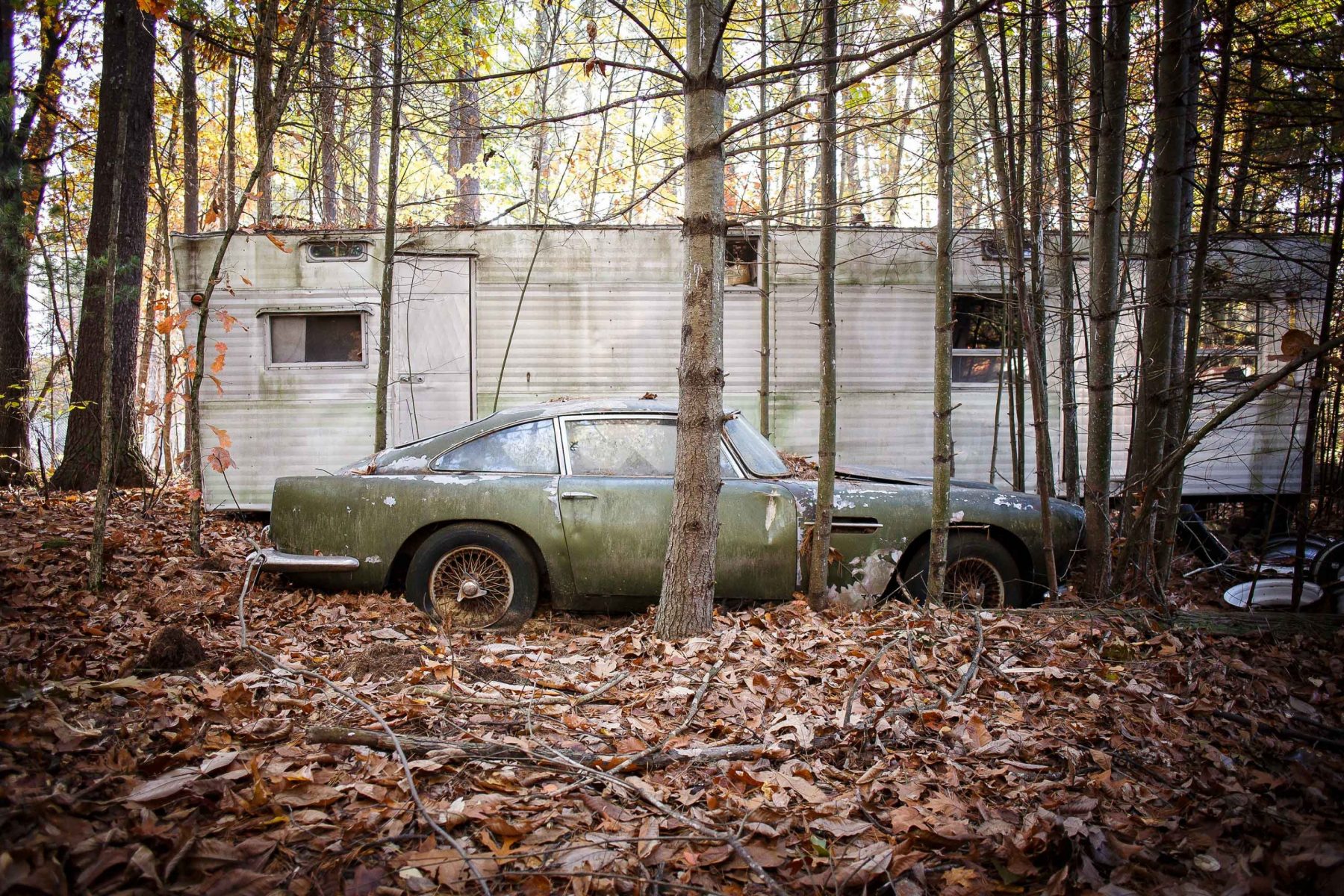 C’est le cas de cette Aston Martin DB4. Découverte par un quidam alors qu’il tentait de récupérer une dépanneuse parmi un lot de voitures vendues par une presque veuve, l’auto était posée depuis presque trente années au milieu de ce bois. Entourée d’arbres, elle a été posée là puis jamais touchée.