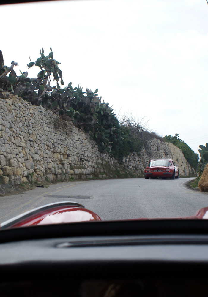 Suivent un virage serré à droite, puis un long gauche en dévers qui débouche encore sur un rond-point. Le droit est abordé sur les freins, puis le long gauche est avalé en troisième, la voiture survirant légèrement avant d’attaquer la montée qui mène à la ligne d’arrivée. Composée de quatre légères courbes qui s’enchaînent, vous passez au ras du mur de la première pour frotter les branches de l’olivier qui borde la seconde. Le six cylindres en ligne crache ses derniers chevaux. A la troisième courbe, prise à la corde, une pierre fait bondir l’auto qui rattrape de justesse son adhérence dans le dernier virage. Vous regardez votre compteur: 140. Une glissade à 140, devant la ligne d’arrivée, devant le public qui semble toutefois en avoir vu d’autres. En un tour, votre vie est passée sous vos yeux au moins dix fois. Loin d’être un circuit d’amusement, le Grand Prix de Mdina est un mélange incroyable de course de côte et d’étape de rallye. Vous commencez à comprendre pourquoi tant de monde parcourt l’Europe afin de se livrer bataille ici, au volant de voitures exceptionnelles, en chemise et pantalon à pinces.