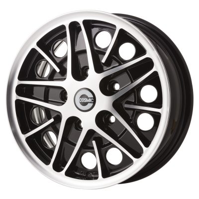 Jante alliage Cosmic 15 X 5,5 pouces, 5 goujons, entraxe 130 mm, ET 25 mm. Destinée aux Porsche 911, 912 et 914 en montage accessoire. Finition noire brillante et aluminium poli.
