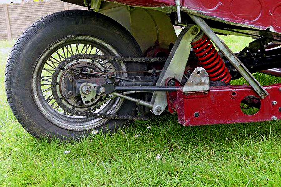 Transmission: Boîte Escort MKI 1968, 4 vitesses + MA, arbre Metalastik Hardy-Spicer, boîte de transfert Reliant, transmission finale par chaîne permettant d’avoir le meilleur rapport pour chaque circuit grâce aux couronnes interchangeables.